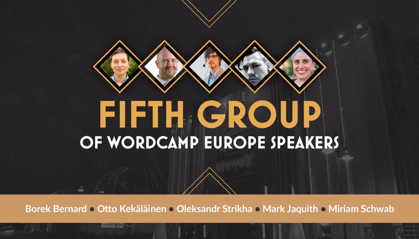 Fifth group of WordCamp Europe speakers – Borek Bernard, Otto Kekäläinen, Oleksandr Strikha, Mark Jaquith, and Miriam Schwab